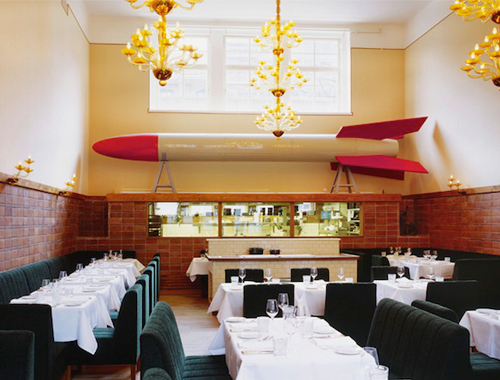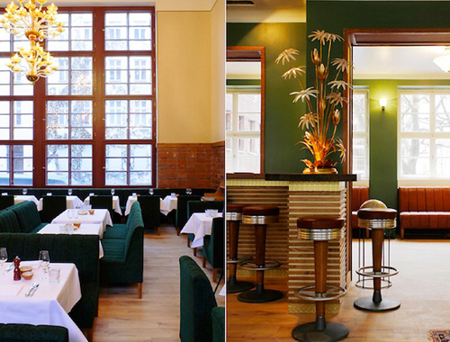 Il ristorante nasce all’interno di una palestra per ragazze di una ex scuola ebraica. L’interno è ispirato ai ruggenti anni 20-30 di Berlino. Lo spazio è stato completamente ridisegnato, e dispone di una gamma di materiali che sono stati realizzati appositamente per questo progetto. In particolare spiccano i sofisticati lampadari di Murano, il tessuto vellutato verde delle sedie, una scultura su misura di un missile in mezzo alla stanza e una cucina che è visibile attraverso una parete di vetro che permette quindi l’apprezzamento collettivo dei piatti.