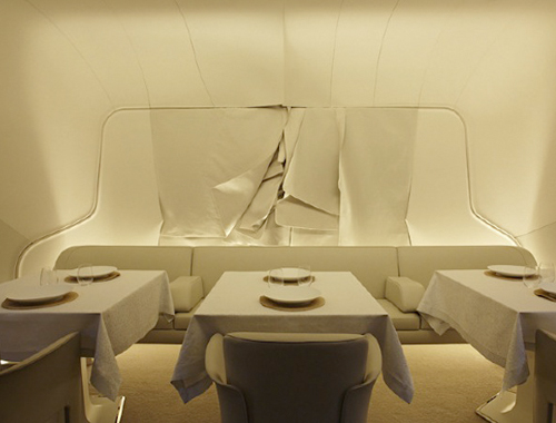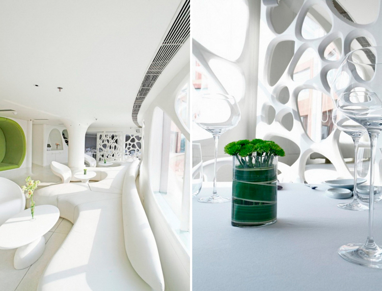 Pensato dai designer Patrick Jouin e Sanjit Manku come un intimo bozzolo per gli ospiti, il ristorante gourmet Sur Mesure situato all’interno del mMandarin oriental Hotel, rende omaggio alla straordinaria haute couture parigina, dove il bianco domina con la sua bellezza senza tempo rendendolo assolutamente chic. A capo della cucina Thierry Marx, uno degli chef più prestigiosi del momento, premiato con due stelle nella Guida Michelin 2012.