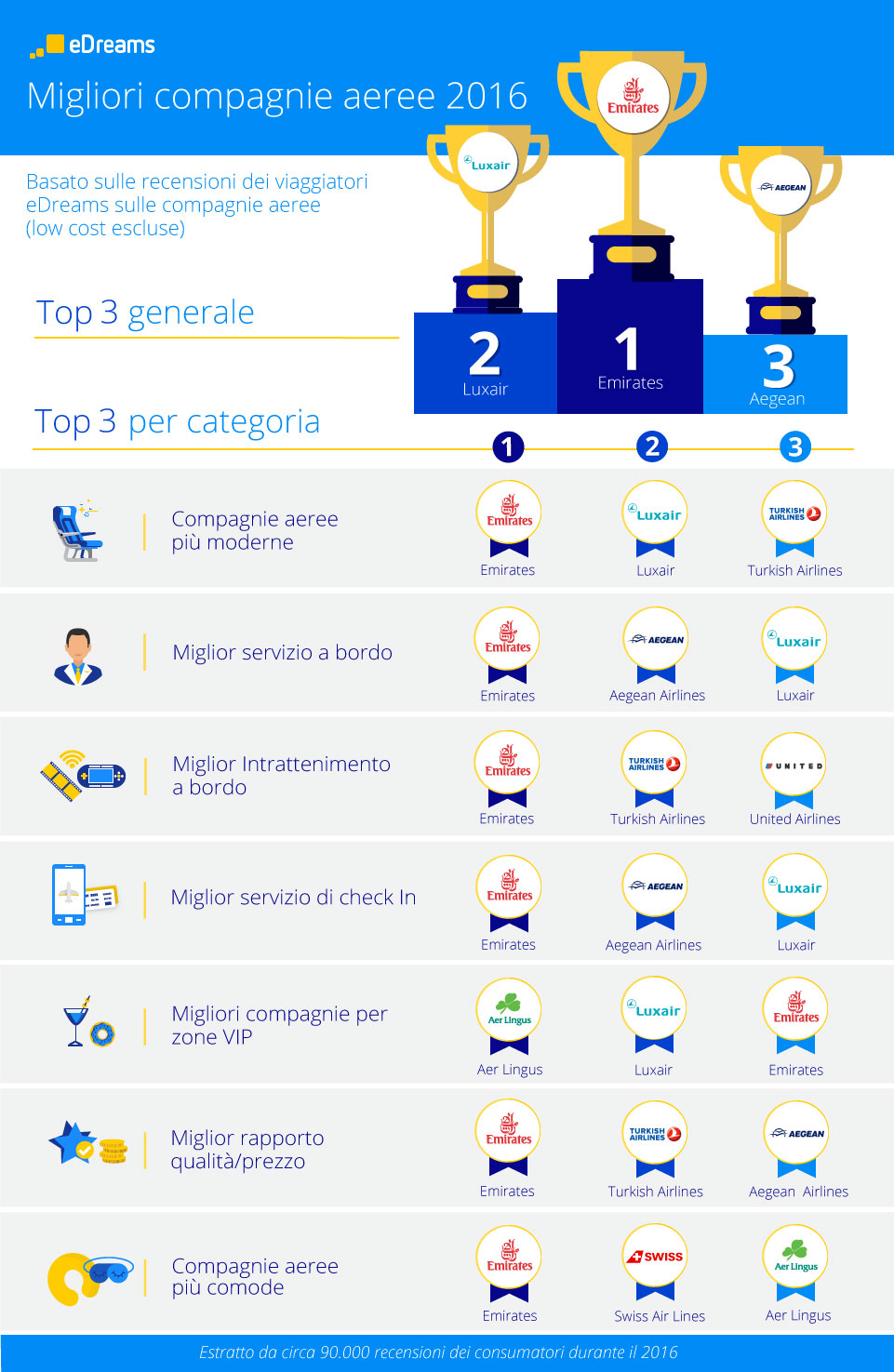 Quest’anno il podio è formato dalle compagnie aeree Emirates, Luxair e Aegean Airlines. Ma cosa avrà di così speciale questa compagnia dell’Emirato Arabo di Dubai per sbaragliare la concorrenza ed entrare nei cuori dei viaggiatori? Le risposte sono molteplici, a partire dall’attenzione che questa flotta, tra le più giovani al mondo, dedica al servizio e ai sistemi d’intrattenimento non-stop in volo, reputati eccellenti dai viaggiatori. Inoltre, grazie a cabine all’avanguardia, con Emirates si può viaggiare nel massimo comfort in qualsiasi classe, con uno spazio extra per ogni seduta e un’illuminazione studiata per ridurre al minimo l’affaticamento da jet lag. Un altro punto a favore di questa compagnia è sicuramente l’attenzione rivolta alle esigenze dei piccoli viaggiatori e delle loro famiglie a bordo dei propri voli, con pasti squisiti, intrattenimento diversificato e velocità al check-in. Ultimi, ma non per importanza, sono la gentilezza del personale di equipaggio e l’ottimo rapporto qualità/prezzo che questa compagnia è in grado di offrire alla clientela.