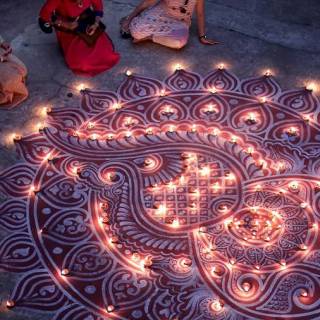 Il secondo giorno, le persone decorano le loro case con lampade di argilla e creano motivi di design chiamati rangoli sul pavimento usando polveri colorate o sabbia.