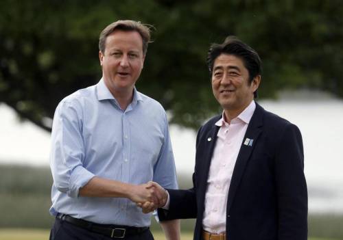 David Cameron (sinistra) e il Primo Ministro giapponese Shinzo AbeDavid Cameron (sinistra) look "casual" per il primo giorno di G8: camicia con maniche tirate su e senza cravatta