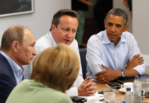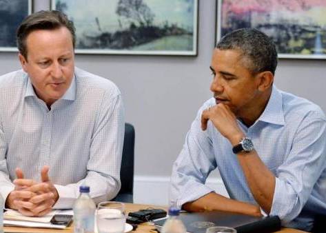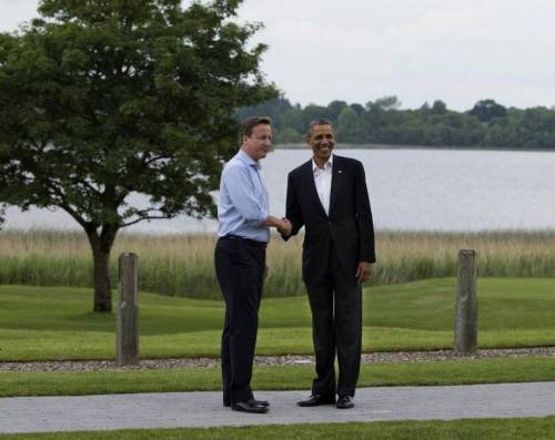 David Cameron (sinistra) e Barack Obama (destra)David Cameron (sinistra) e Barack Obama (destra). Barack Obama partecipa al secondo giorno del G8 in camicia e maniche rigorosamente tirate su