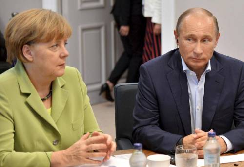 Vladimir Putin (destra) e Angela Merkel (sinistra)il Presidente russo Vladimir Putin (destra) e la cancelliera tedesca Angela Merkel (sinistra). Lei in occasione del G8 indossa la tanto amata giacca verde.
