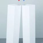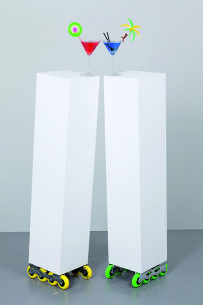 I due cocktail con l’ombrellino, posti su due identiche colonne bianche, potrebbero alludere a un brindisi e a una piacevole chiacchierata tra conoscenti. Allora, perché le due colonne poggiano su delle rotelle? Qual è il significato sottinteso?