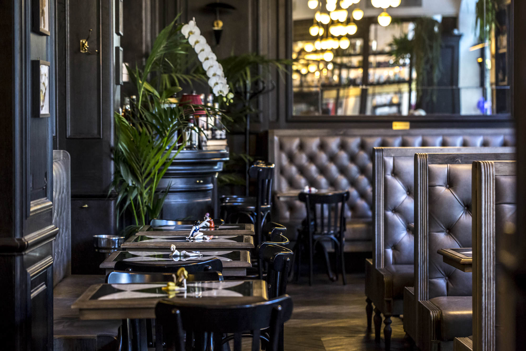 Durante la serata ci si potrà soffermare tra gli animali esotici in ferro battuto del dehor (sì, dalla scorsa estate si può piacevolmente mangiare anche all’esterno), o all’interno dei salotti, tra le carte da parati chinoiserie, ammirando la collezione di farfalle di inizio secolo o giocando con le piccole bagnanti di Deauville, fermandosi a chiacchierare negli angoli più discreti del Boudoir.