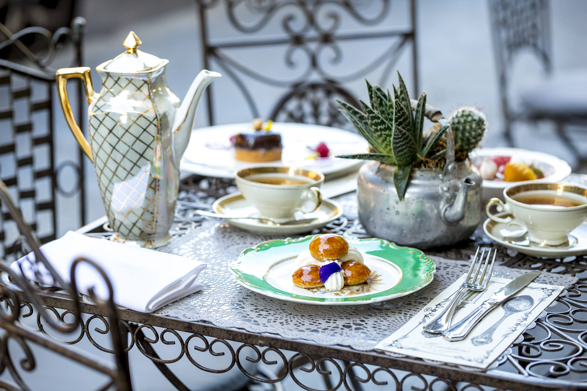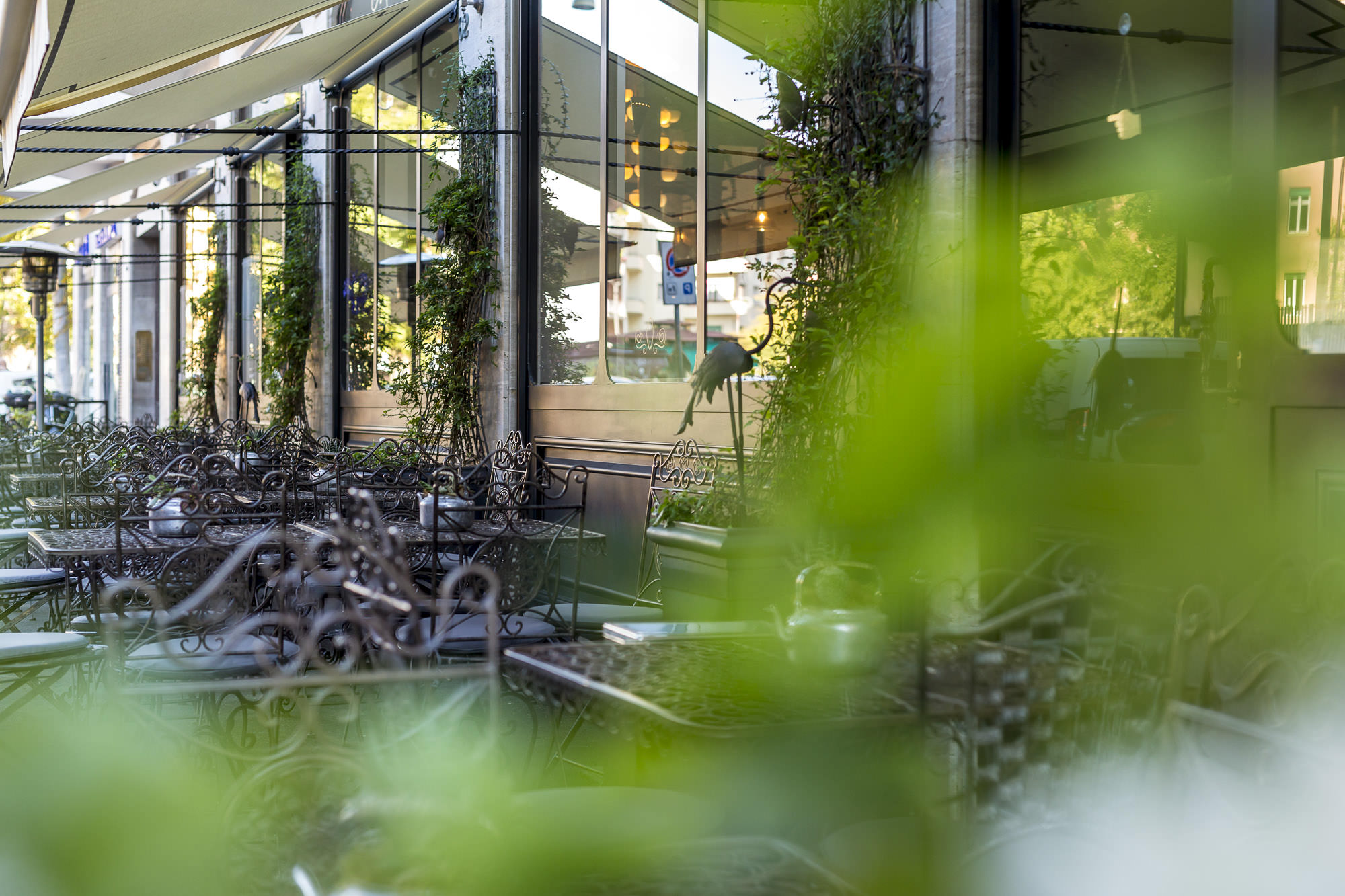 Nello stesso modo, il dehor realizzato durante l’estate vede tavoli e sedie in ferro battuto disegnati dal designer mentre sulle pareti esterne animali esotici (sempre in ferro battuto) ricreano ambientazioni magiche. Niente è stato lasciato al caso: e in ogni momento, fiori freschi, cura senza requie rendono sempre Madeleine un locale splendido e accogliente.