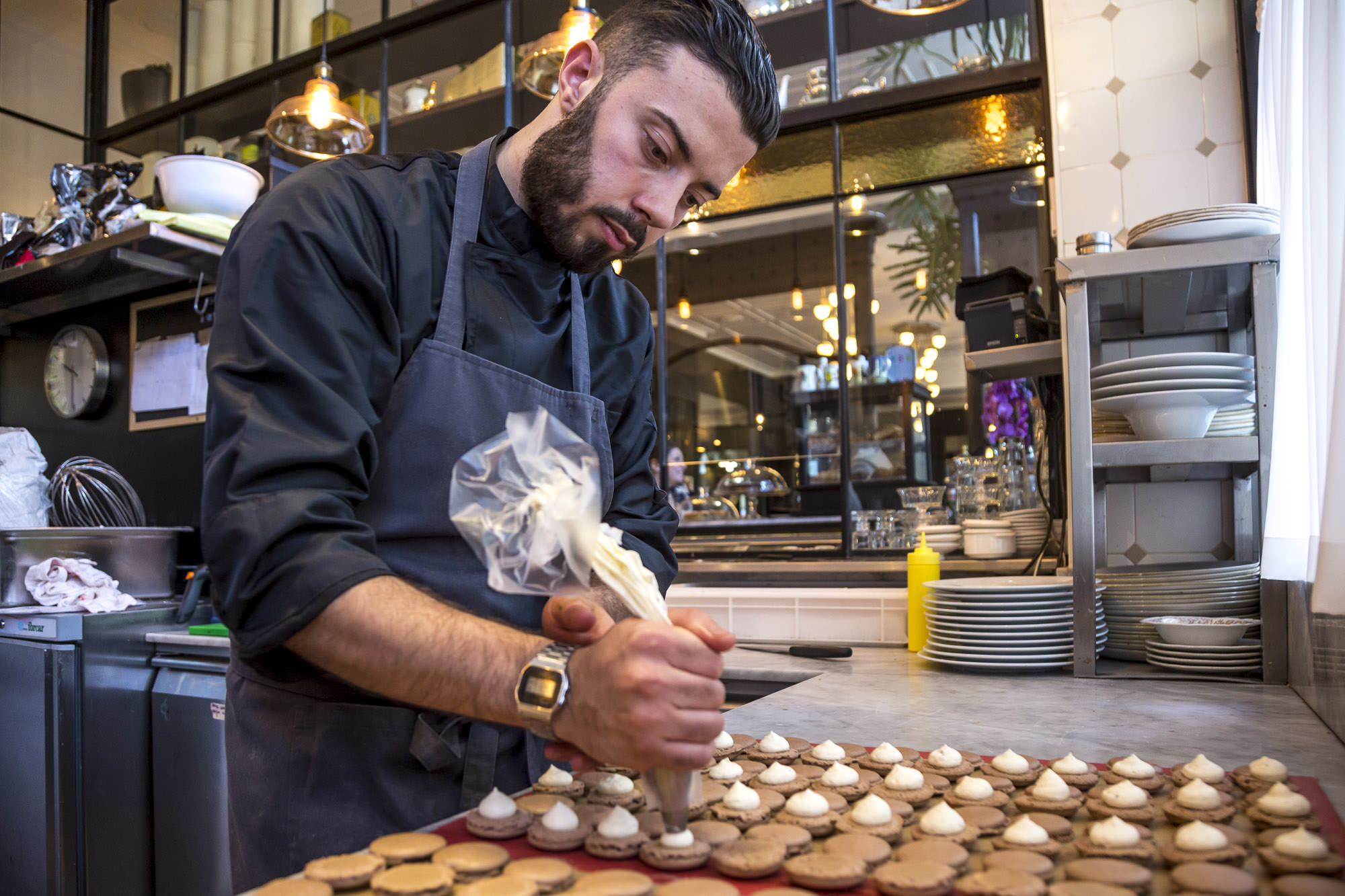 Madeleine – Salon de Gastronomie è un mondo che, durante il suo primo anno, ha maturato consapevolezza, diventando fin da subito uno dei locali preferiti dai romani: la bellezza dell’ambiente, curata dal designer Matteo Parenti, si è sposata con la bontà dei sapori, la calda accoglienza e la ricerca del bello formale si è fusa con il buono delle ricette di cucina e i dolci della pasticceria, mentre le brigate di sala e di cucina si muovono in piena armonia. Madeleine, infatti, è retta da una squadra giovane e determinata: Simone Ballicu e Daniele Ladaga sono i giovani chef di cucina mentre la Pasticceria, sia da asporto che da gustare in loco, è affidata a Mattia Mezzina che da pochi mesi è arrivato a creare macarons e madeleine dai nuovi profumi e dalle perfette consistenze. Infine, la zona Boudoir è, fin dal primo giorno, curata da Federico Leone che per questa nuova carta invernale ha dato spazio agli infusi e agli sciroppi, come quello allo zafferano, da lui stesso prodotti.