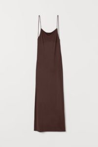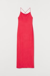 Abbiamo individuato un abito molto tattico del brand svedese H&M (guarda la foto del vestito). Un capo lungo e scollato ideale per l’estate. Il capo viene così descritto sul sito: “Abito lungo e aderente in jersey lucido dalla caduta elegante. Linea dritta in alto, spalline sottilissime da annodare sulla schiena. Profonda scollatura sulla schiena, spacco dietro. Foderato. Modello: Linea aderente. Composizione: viscosa 96%, elastan 4%, fodera interna: poliestere 100%”. E’ disponibile in due colori: rosso e marrone. Prezzo: 39.90 euro. Le taglia variano dalla XS alla XL.