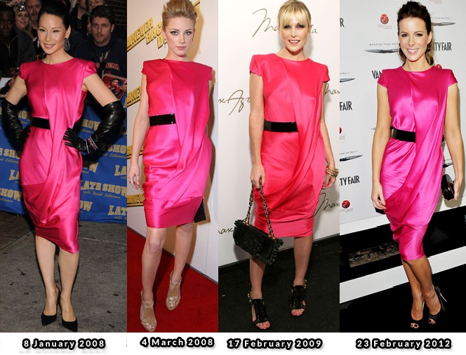 La socialite Tinsley Mortimer ha scelto questo abito nel febbraio 2009 in occasione della sfilata di Max Azria, anche lei in versione rosa acceso. Ha abbinato poi degli accessori neri, tra cui spicca una inconfondibile borsa Chanel.