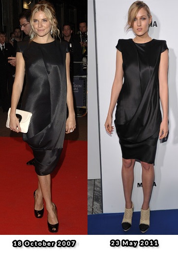 Sienna Miller è stata la prima ad indossare questo abito drappeggiato di Alexander McQueen della collezione p/e 2007, nel mese di ottobre dello stesso anno in occasione della première del suo film ‘Interview’ durante il 51° BFI London Film Festival. Sienna ha scelto di sfoggiare l’abito in maniera molto semplice, nella versione nera, con pump nere.