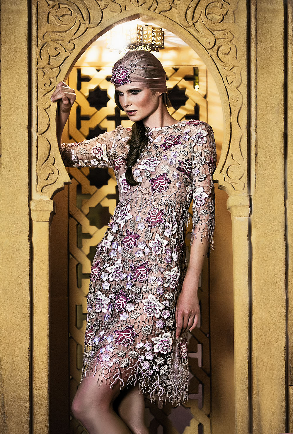 Satin, mussole di seta, mikado, pizzo chantilly, macramè, a volte ricamati, si ispirano ai colori di Dubai negli abiti lunghi, austeri, decisamente raffinati. Le tonalità delicate del rosa del deserto; il bianco candido del Kandura; l’acciaio dei grattaceli avveniristici come il Burj Khalifa, Burj al-Arab o l’Emirates Tower.