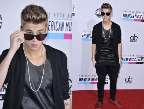 Justin Bieber in cardigan Dior Homme, canotta di pelle e pantaloni di Kemal + Karla, scarpe Unif. Justin Bieber in cardigan Dior Homme, canotta di pelle e pantaloni di Kemal + Karla, scarpe Unif.
