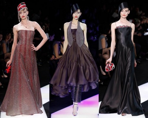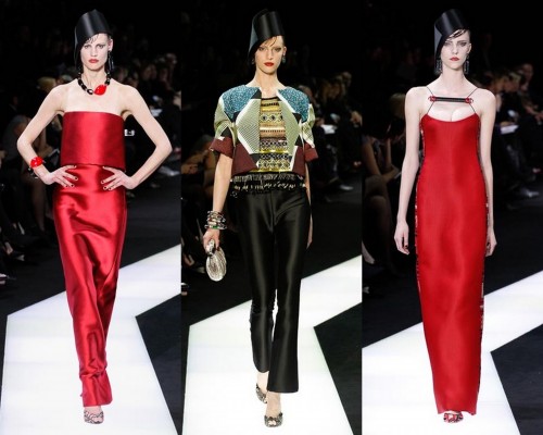 Ma c’è di più perché sulla passerella di Armani Privè questa volta vi è un tocco velatamente orientale, nulla di geograficamente scindibile perché Giorgio Armani lo sa quanto sia facile, poi, cadere nel folkoristico e rovinare la magia dell’haute couture. Così è visibile qualche eco di Medio Oriente sapientemente adagiato, e lo stilista non cade nell’errore: “per essere diversa e personale l’alta moda deve essere coraggiosa e rischiosa, ho cercato di vederla con gli occhi di un cittadino del mondo” poi aggiunge: “Non sono veri tessuti etnici, sono fatti in maniera italiana, ma c’è un effetto d’insieme che mescola Marocco e deserto americano, Africa e Oriente, nulla di coordinato e definito”.