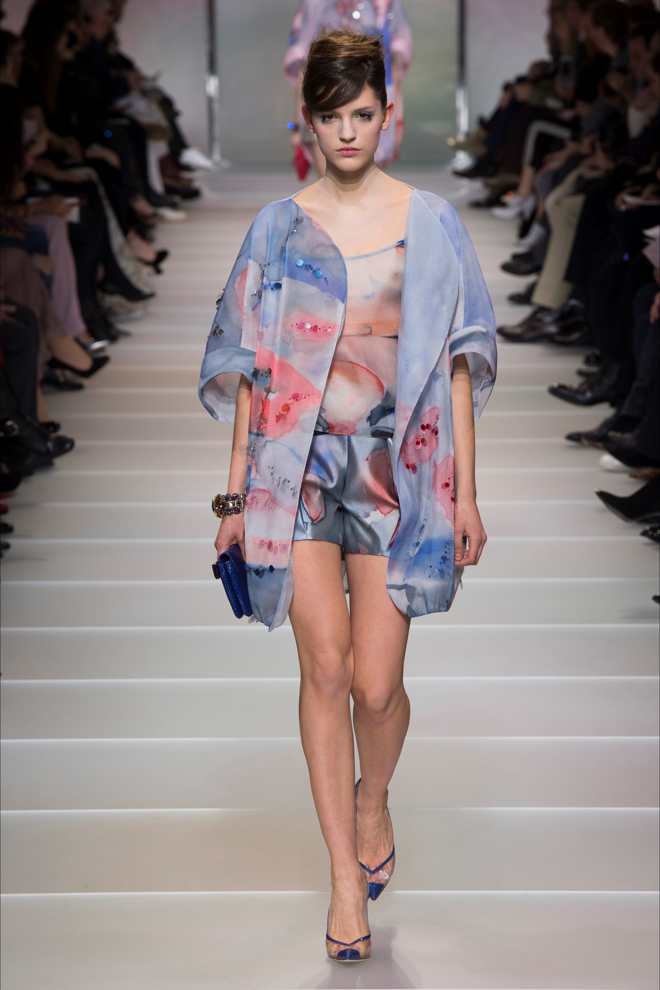 A dispetto delle temperature da sauna, lo spazio espositivo della sfilata risultava luminoso e arioso: muri bianchi e retroilluminati di blu, rosso e grigio che ricordavano cieli pittoreschi, lo stesso spirito luminoso che è apparso in molti degli abiti della collezione, sapientemente dipinti di sbavature acquarellate e trame scintillanti.