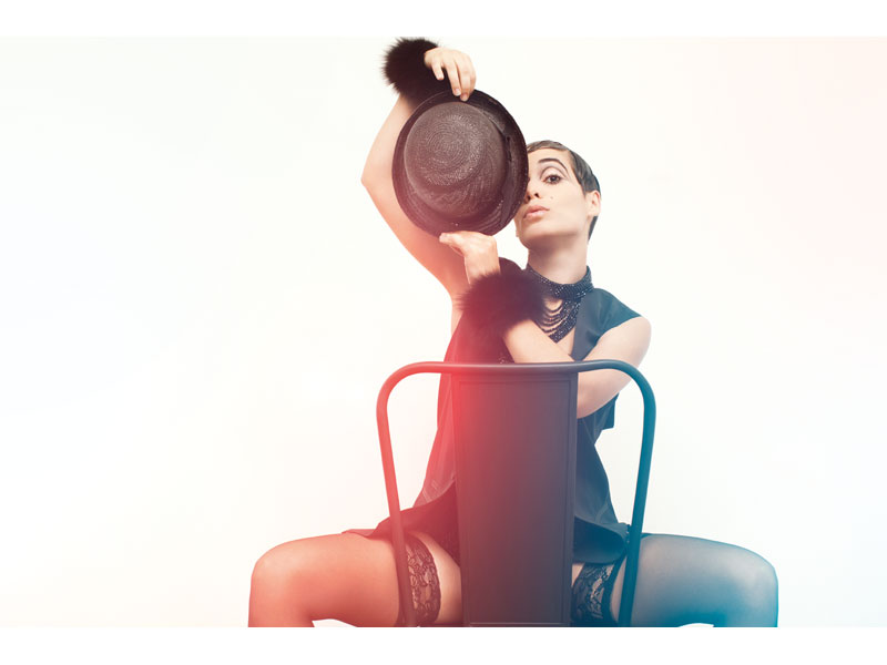 Diane Fleri come Liza Minnelli in Cabaret, 1972. Gilet di lana, Dolce&Gabbana. Guêpière, calze autoreggenti e polsini di piume, La Perla. Collana di perline, Etro. In tutto il servizio: cappelli, Borsalino.