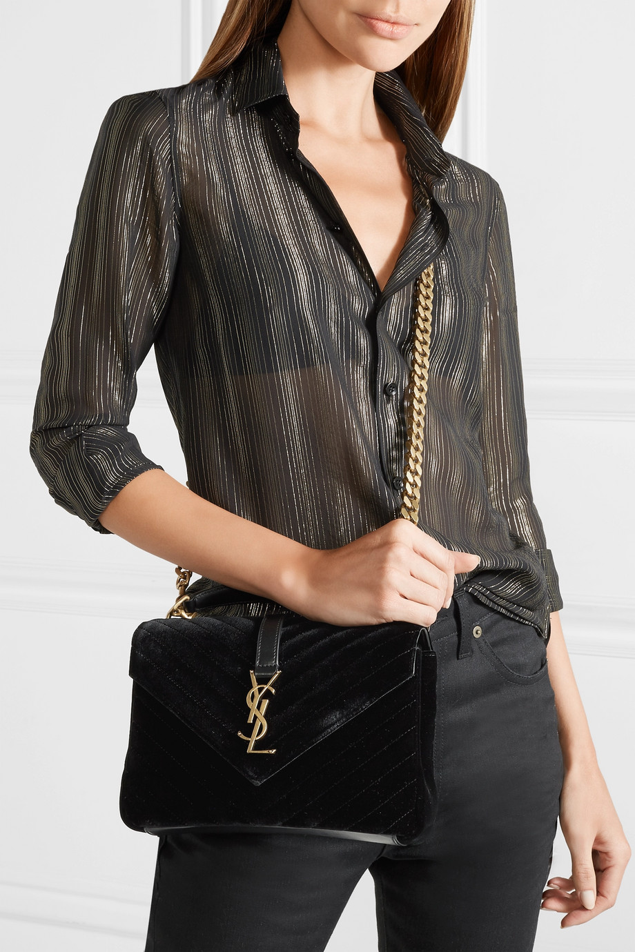 SAINT LAURENT College medium leather-trimmed quilted velvet shoulder bag, €1,790SAINT LAURENT College medium leather-trimmed quilted velvet shoulder bag, €1,790