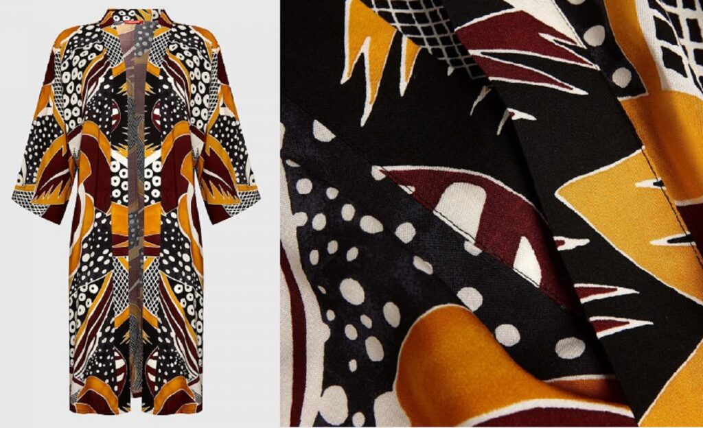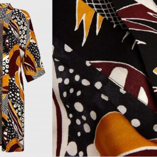 Il capo è realizzato in viscosa con una vivace fantasia estiva d’ispirazione etnica e può essere ideale sia per il mare sia per la città.
