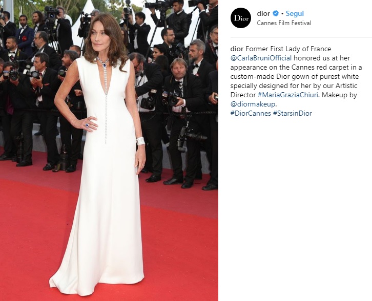 L’esempio più clamoroso è quello di Carla Bruni, che ha sfoggiato un abito lungo e scollato firmato Maria Grazia Chiuri, direttore artistico di Dior. Un vestito tanto semplice quanto sofisticato, elegante. magnetico, che metteva in risalto la bellezza della modella.