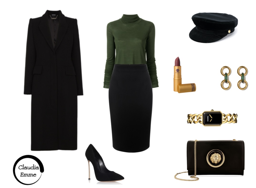 Se pensi che il newsboy hat si abbini solo ai look casual, questo outfit ti farà ricredere. Scegli un maglioncino verde bosco a collo alto, aggiungi una pencil skirt a vita alta nera, tacco e cappotto entrambi neri e aggiungi accessori nero e oro, come la borsa Versace e l'orologio Gucci. Un tocco di rossetto rosso e il tuo look elegante è pronto.
