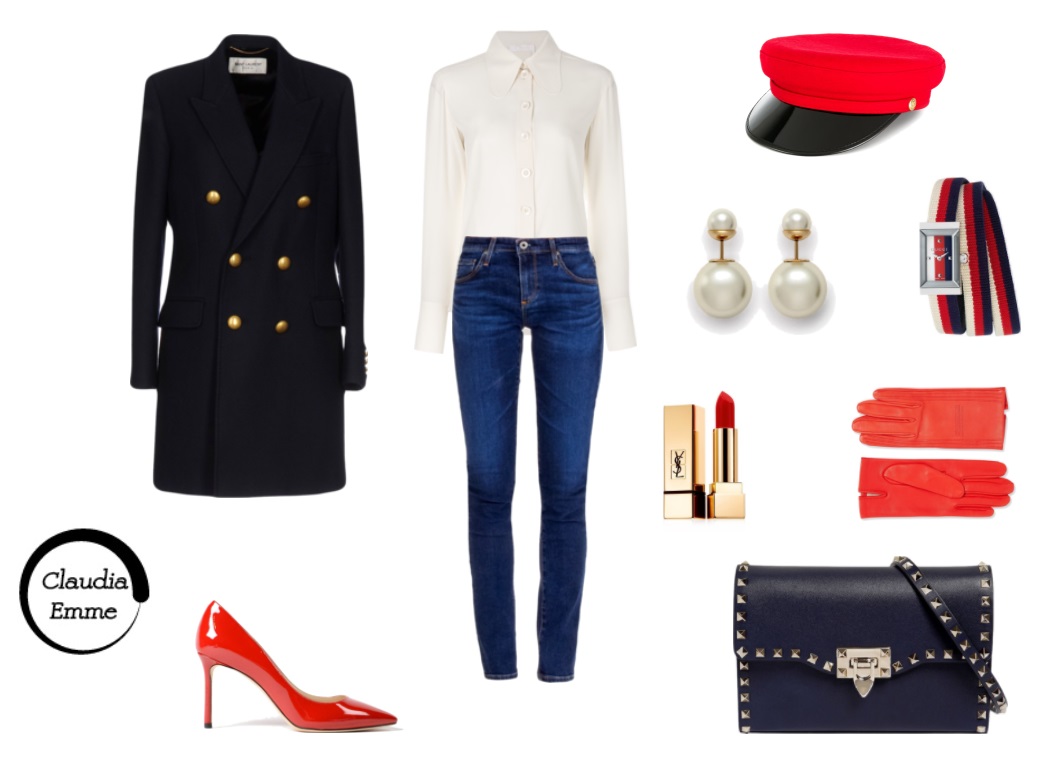 Indossare un newsboy hat rosso (questo è firmato Manokhi) pensi sia impresa impossibile? Guarda qui: scegli un jeans skinny, aggiungi una camicia bianca, un tacco rosso e un cappotto doppiopetto blu scuro (questo è Saint Laurent). Aggiungi guanti rossi di pelle, orecchini con perline (Dior), rossetto rosso e una borsa blu in pelle (questa è Valentino).
