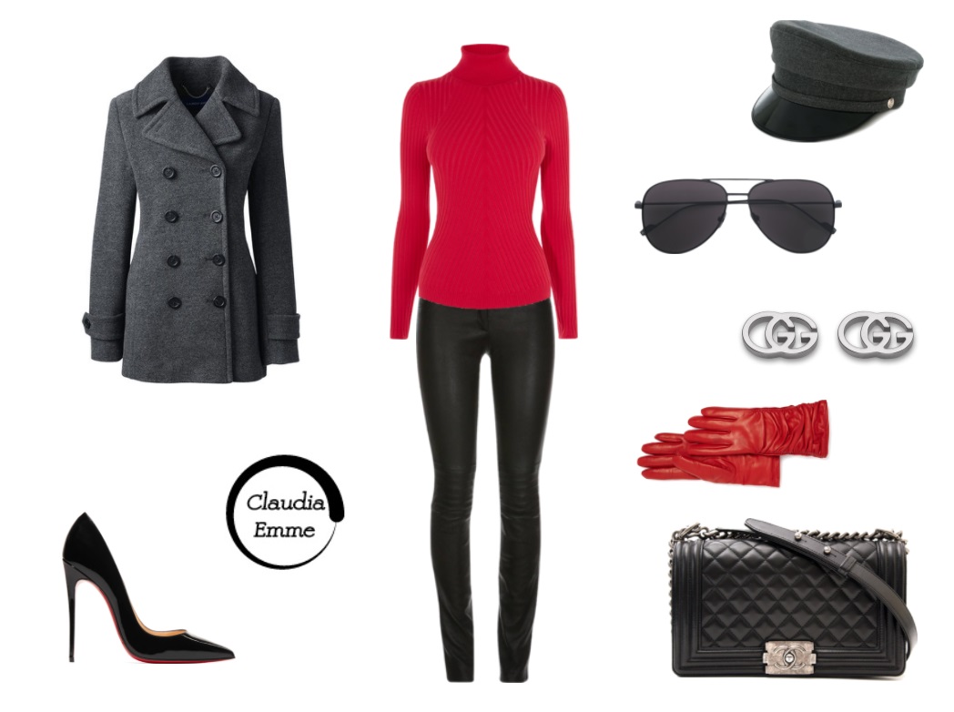 Newsboy hat in feltro grigio scuro (Manokhi), abbinalo così: parti da un maglioncino rosso a collo alto, aggiungi un pantalone skinny di pelle, avvolgiti in un cappotto grigio scuro (questo è Lands' End, 80 euro sul sito). Aggiungi borsa trapuntata (Chanel), guantini rossi di pelle, orecchini in metallo e occhiali a goccia grigi.