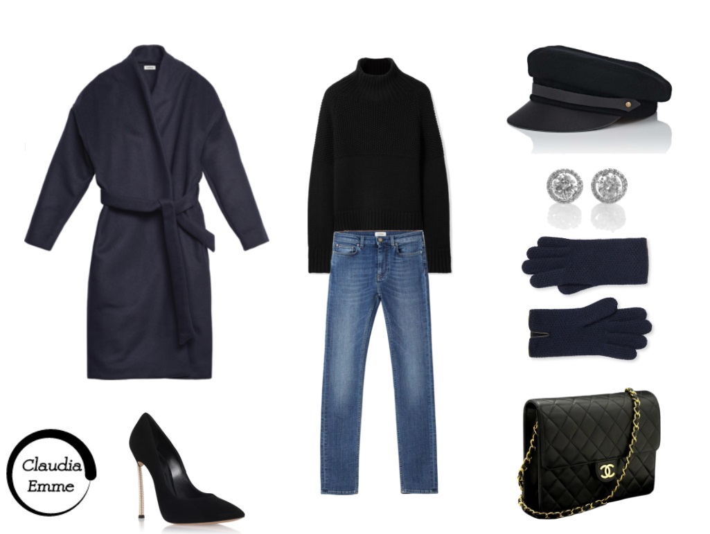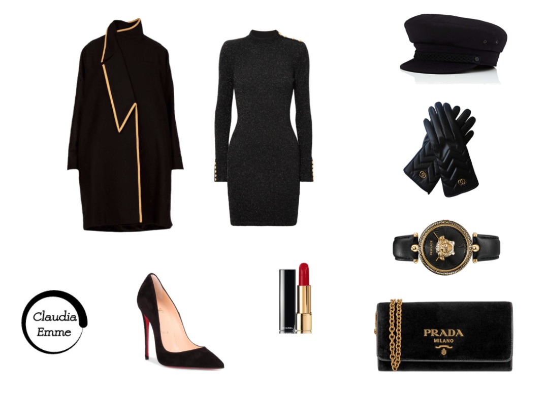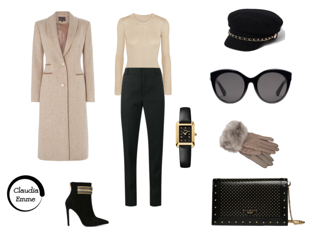 Newsboy hat nero con catena oro (River Island, 29 euro sul sito), abbinalo così: scegli una maglia a maniche lunghe color crema, aggiungi un pantalone nero a sigaretta satin (questo è Saint Laurent), tronchetto nero (Balmain) e avvolgiti in un cappotto beige chiaro (questo è Really Wild, a saldo a 222 sterine sul sito). Orologio di pelle nero e oro (Fendi), borsa nera in pelle con inserti oro (Balmain), guantini con pelliccia (UGG) e occhiali oversize (Gucci).
