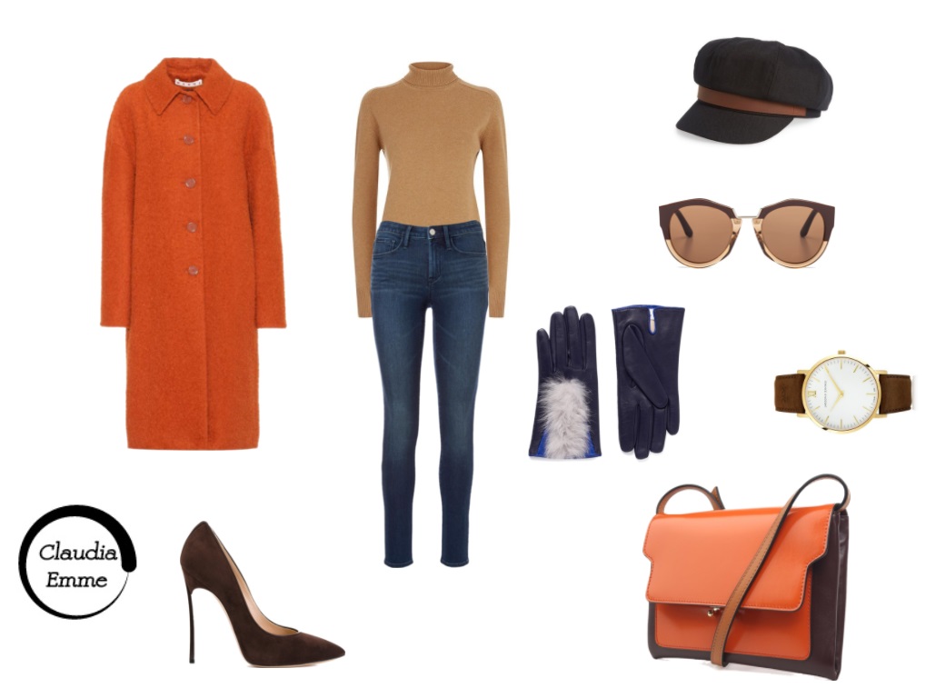 Vuoi sfoggiare un look casual chic? Scegli il newsboy hat sui toni caldi del marrone (brixton, Montreal cap). Inizia da una semplice maglia a collo alto beige, aggiungi un jeans skinny e avvolgiti in un cappotto arancione per un tocco glamour (questo è marni). Abbina un tacco marrone in suade, borsa arancio e marrone (Marni Trunck Pouch) guantini blu (Aristide) e occhiali sui toni del beige.