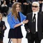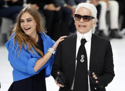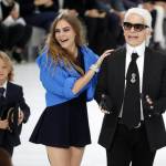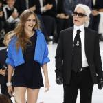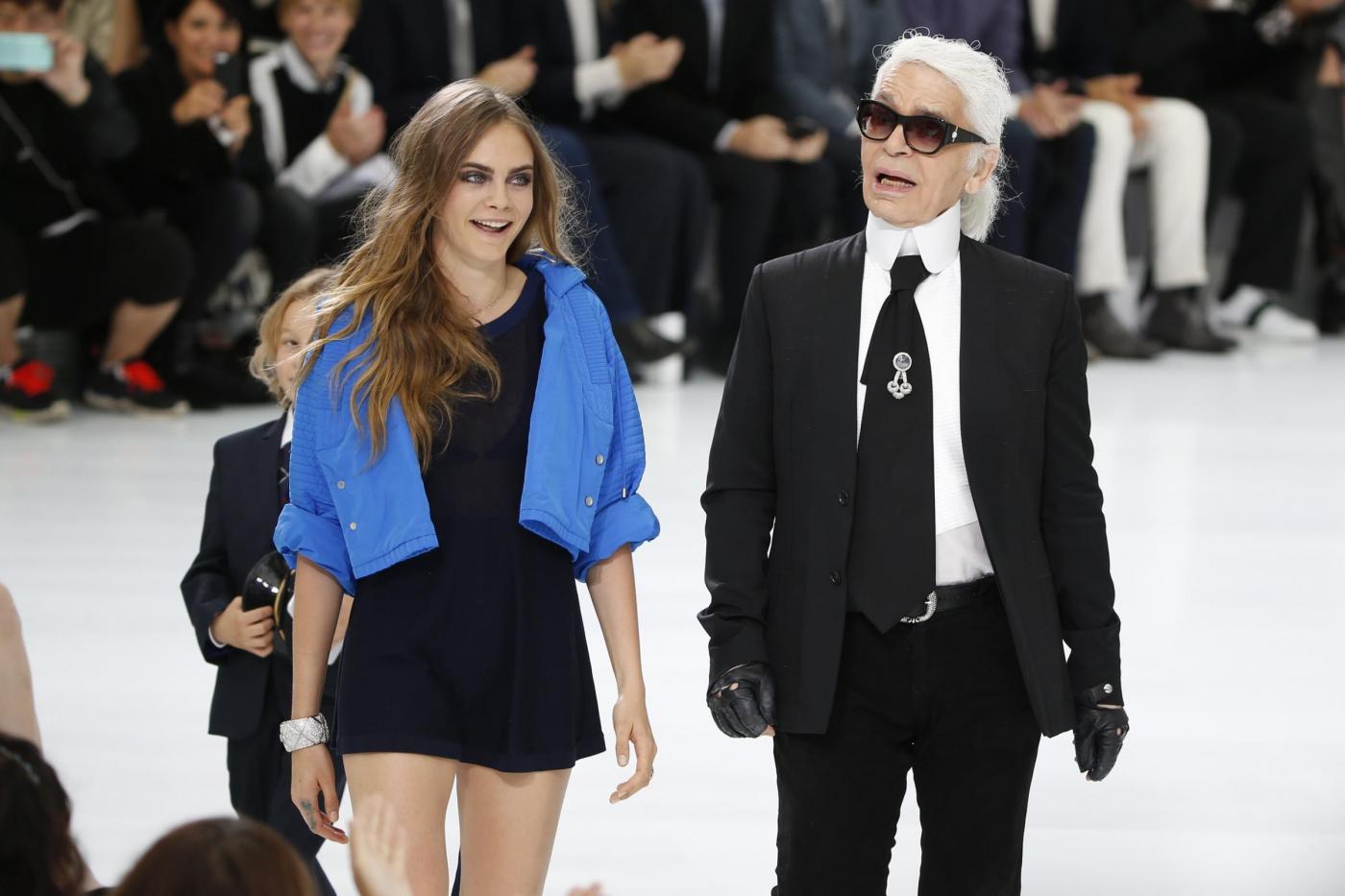 German designer Karl Lagerfeld (R) and model Cara Delevingne (C) appear at the end of his Spring/Summer 2016 women's ready-to-wear collection for fashion house Chanel at the Grand Palais which is transformed into a Chanel airport during the Fashion Week in Paris, France, October 6, 2015. REUTERS/Charles Platiau