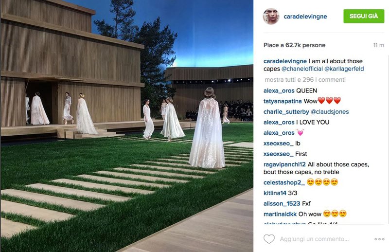 “D’altronde dopo aver sfilato tirando la lingua e aver lanciato per prima i selfie in passerella, Cara può davvero concedersi di tutto grazie anche alla complicità di stilisti come Karl Lagerfeld. Seduta in prima fila Cara ha postato sul suo Instagram i capi preferiti del fashion show dimostrando che anche se ha deciso di buttarsi nella recitazione il suo cuore batte ancora per la moda?”