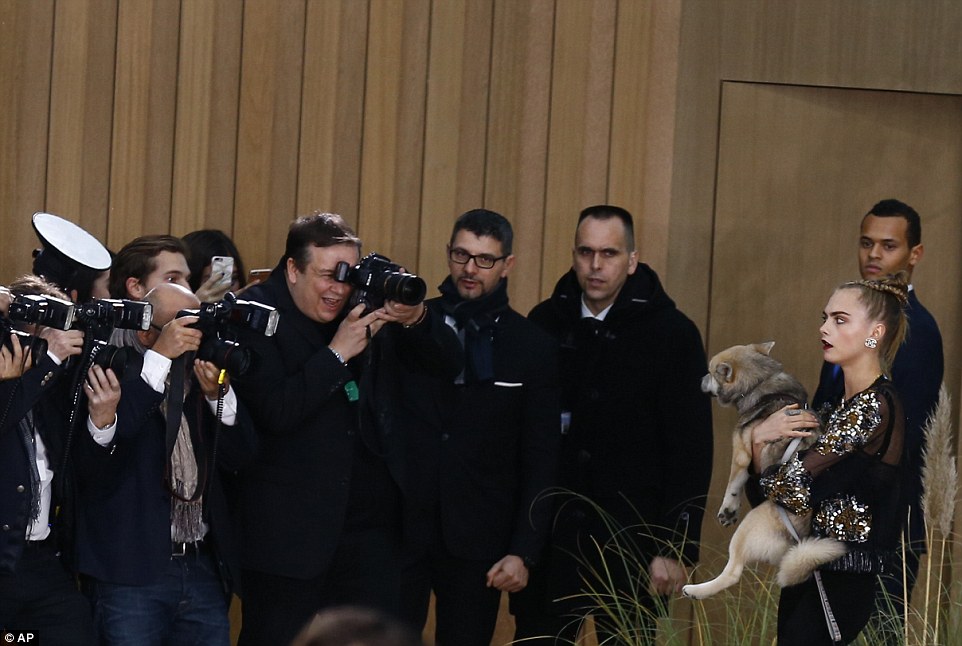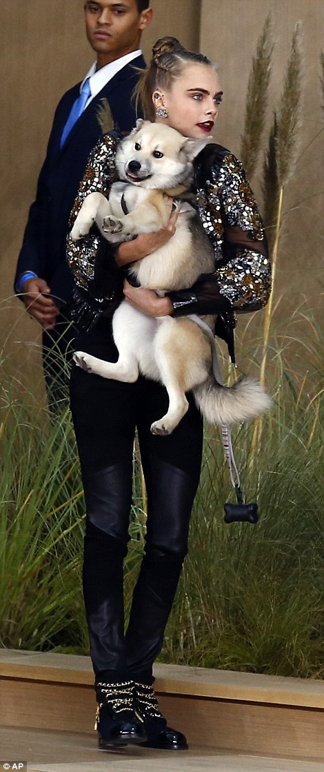 Cara sta vivendo un momento che l’ha portata all’apice della celebrità: la “trovata” del cane è stata interpretata come un messaggio chiaro di amore per gli animali in un ambiente – quello della moda – da sempre abituato ad usare gli animali piuttosto che rispettarli. Le foto le pubblica il Daily Mail .