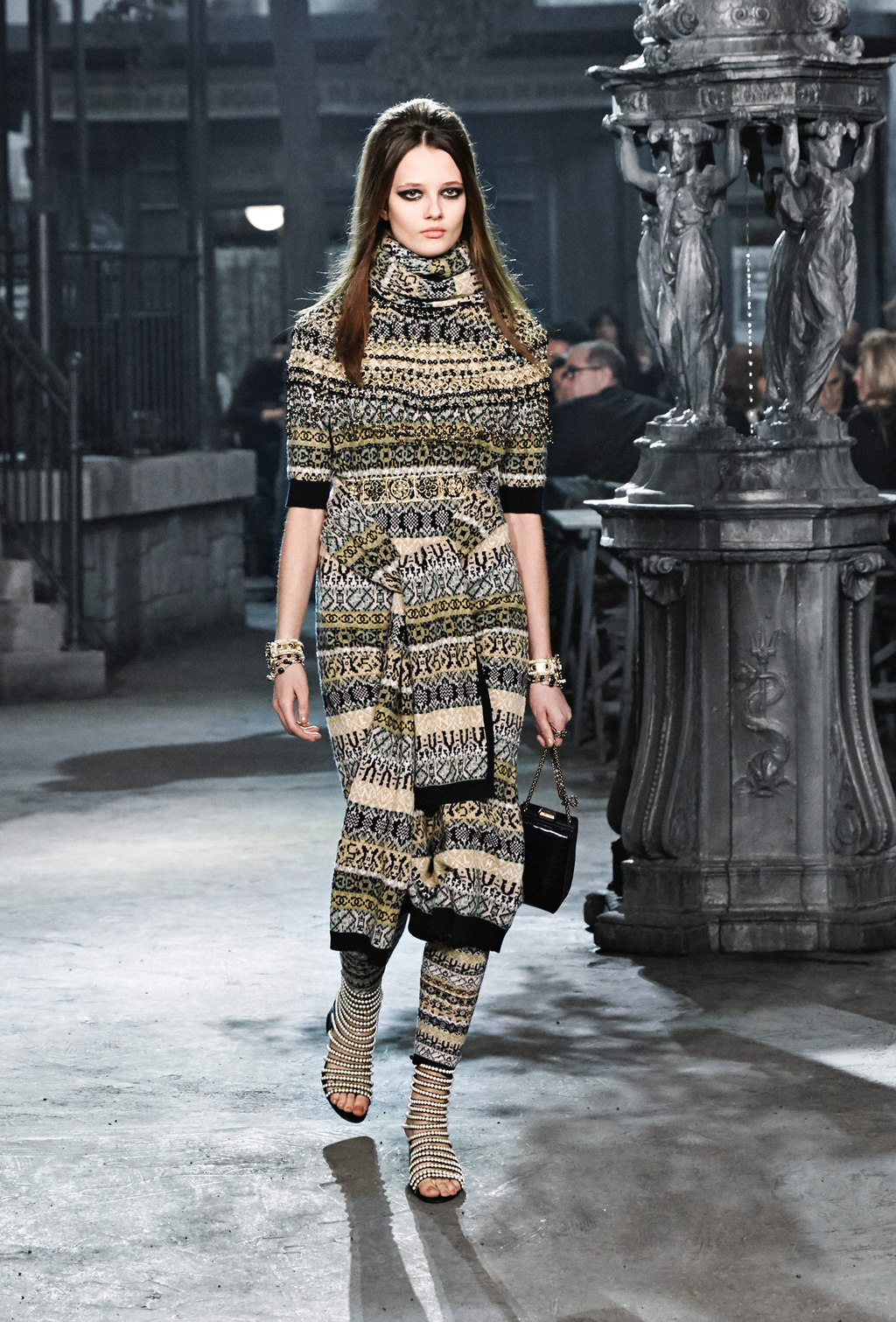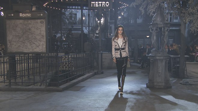 Dopo Salisburgo l’anno scorso, Dallas nel 2013, Edimburgo nel 2012 e i precedenti show a Mumbai e New York, Chanel ha scelto Roma e qui 52 modelle tra cui Lara Stone, Freja Beha Erichsen, Bella Hadid (sorella di Gigi), Mariacarla Boscono, Jemie Bochert, escono da una metropolitana con fermata “Roma”, a sottolineare il sodalizio tra la Ville-Loumière e la Città Eterna, e sfilano con outfits dai colori desaturati, insieme al nero, al cipria, rosa antico, arancio, crema e beige.