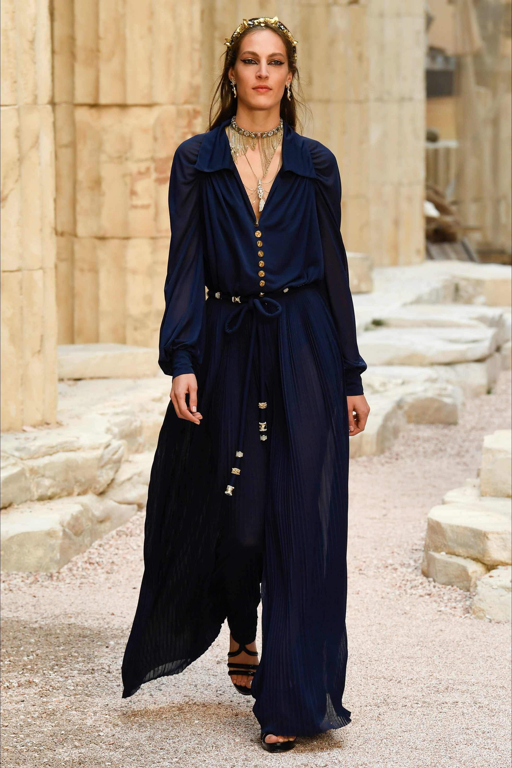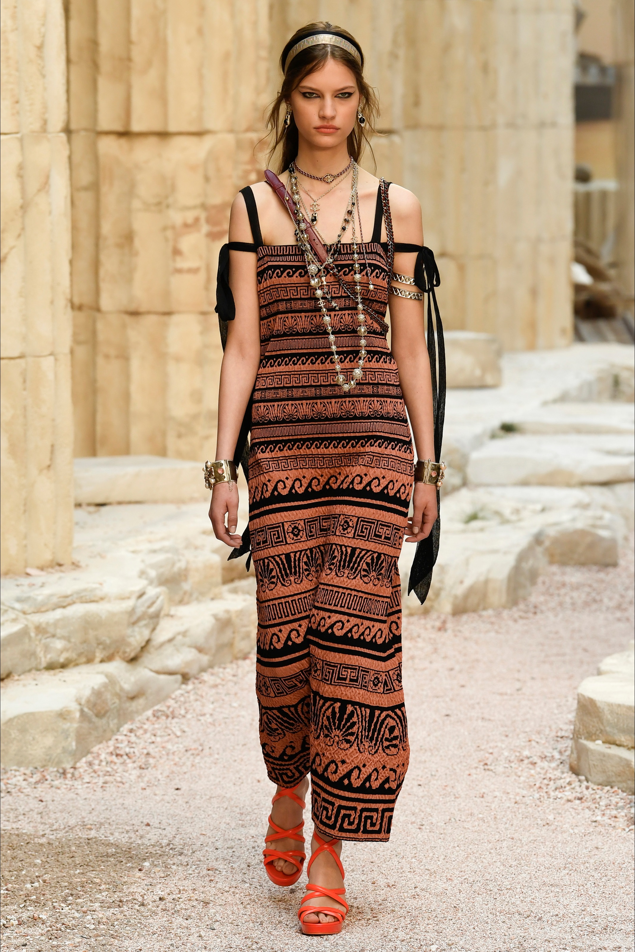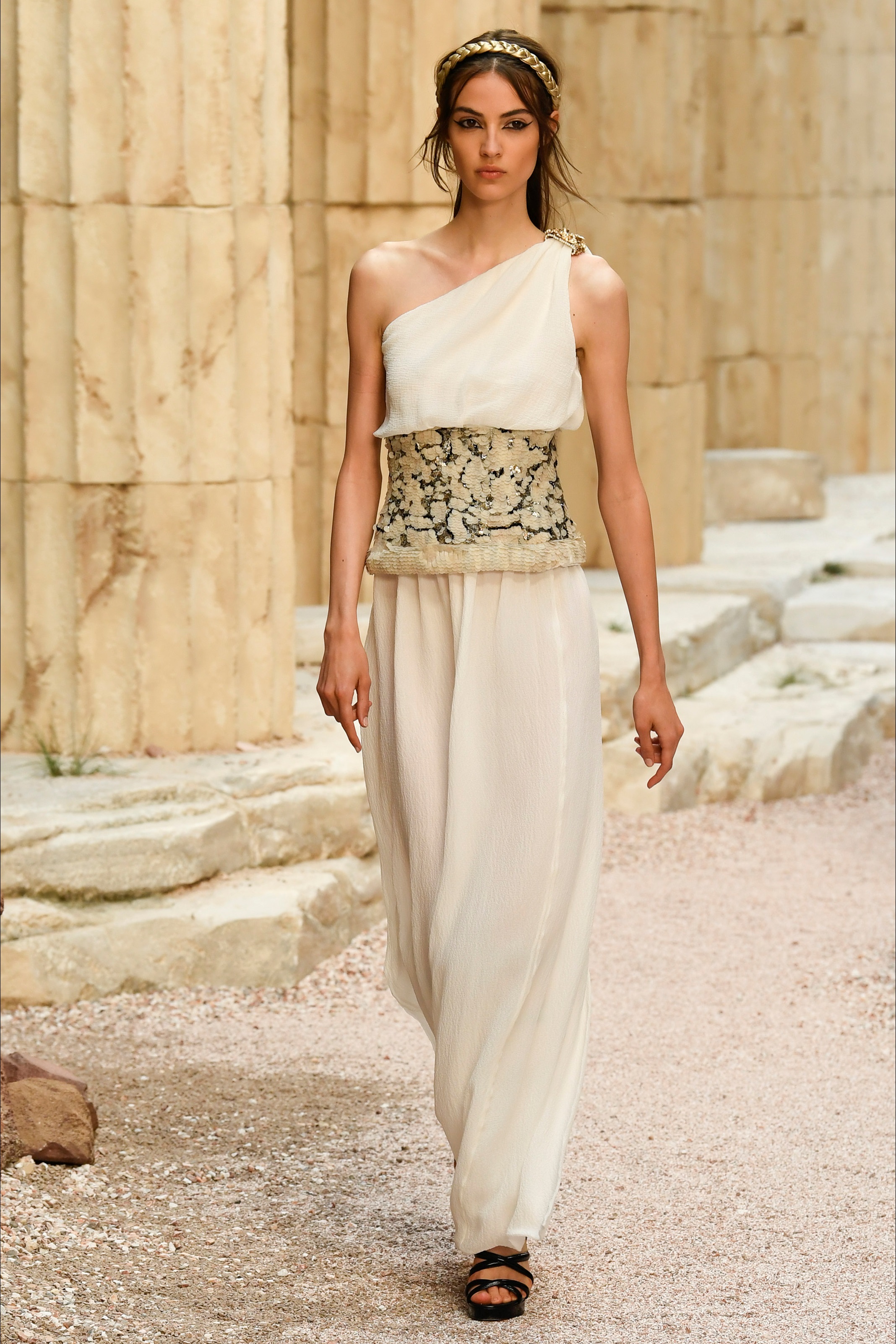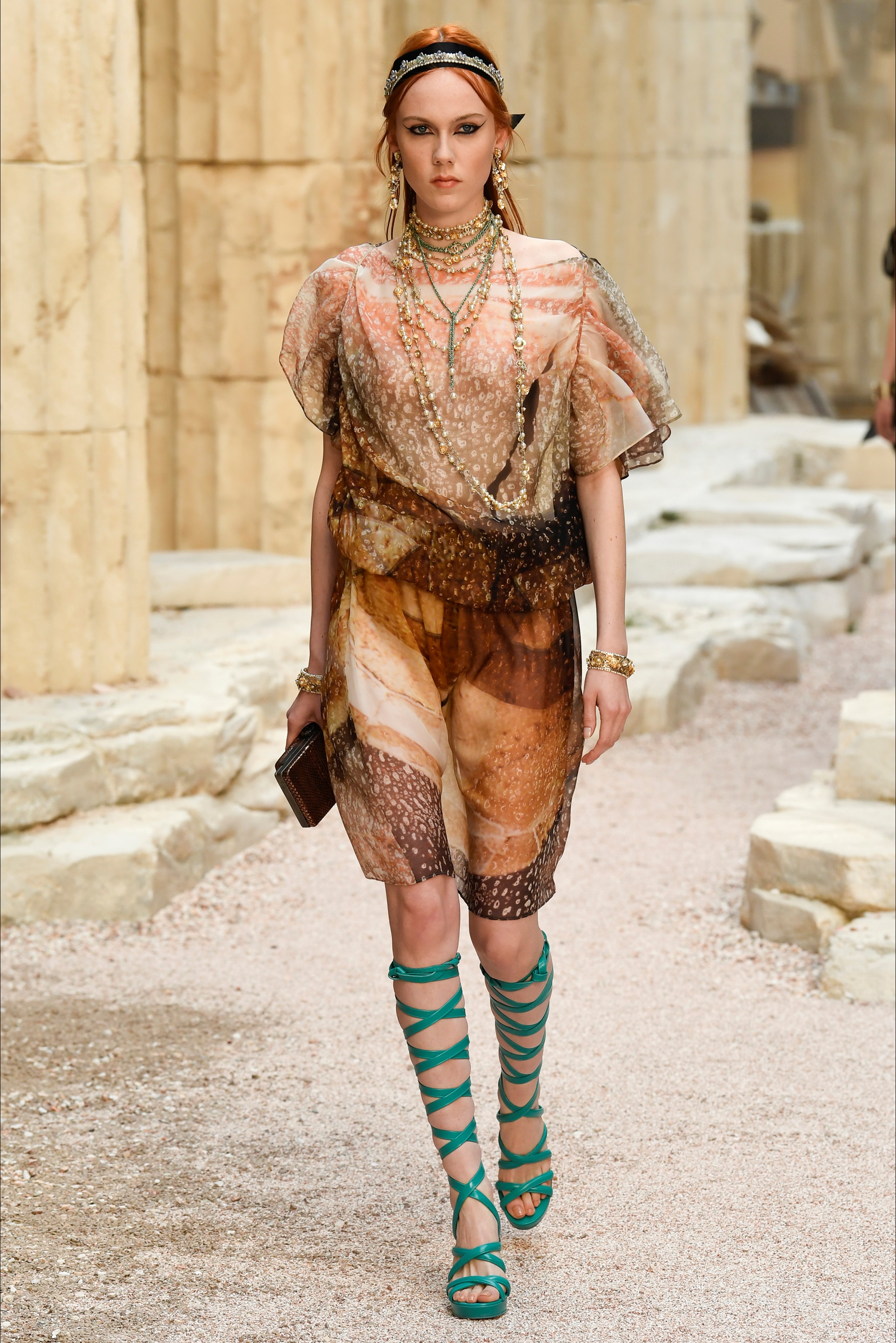 PARIGI – Chanel pre-collection P/E 2018: omaggio all’antica Grecia FOTO. Il Grand Palais di Parigi diventa quasi un tempio dell’antica Grecia. Karl Lagerfeld rievoca le memorie del grande passato con abiti in stile impero e a palazzo che ricordano le forme elleniche, i sandali sembrano riecheggiare quelli dei valorosi gladiatori e delle ancelle, i vestiti da sera diventano tuniche preziose da indossare con cinturoni, bracciali tintinnanti e numerosi e tiare-gioiello. Karl Lagerfeld, a poche ore dallo show, ha affermato: