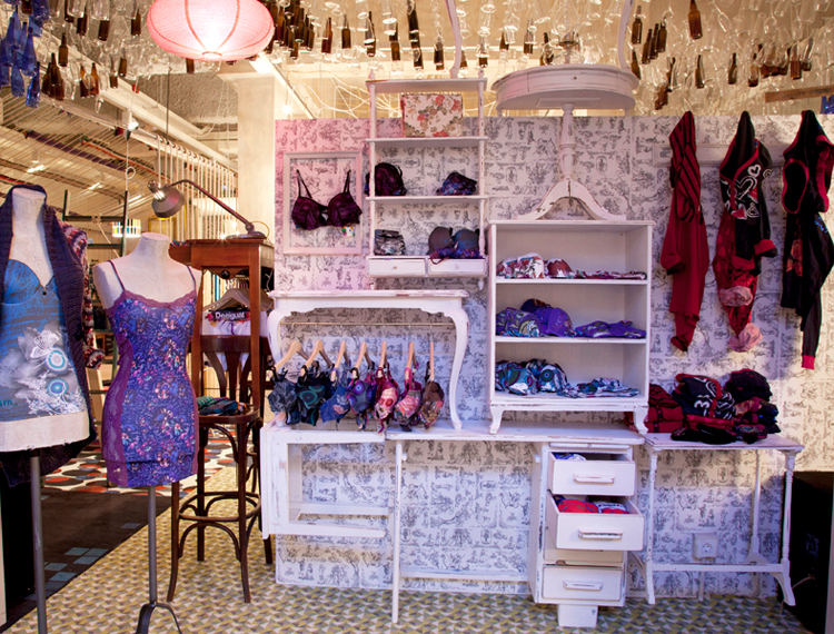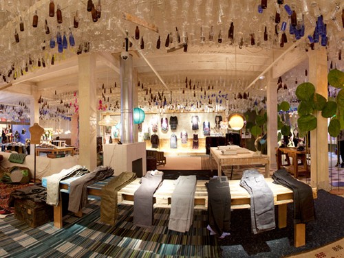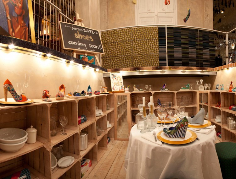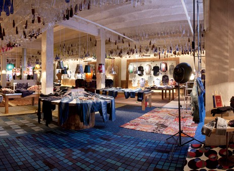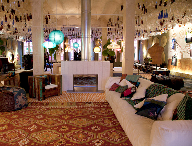 Lo Showroom Store, 800 m2 in Calle Caspe a Barcellona, è un immenso bazar, in cui ricordi di viaggio, mobili antichi, opere d’arte e lampade d’epoca si mescolano in uno spirito bohemien. I capi di abbigliamento sono appesi su corde. Come in un accogliente salotto, dappertutto comodi divani, nei camerini poltrone in pelle. Telefoni in bachelite, pouf a stampe floreali, finestre con vetri colorati, carta da parati, ciotole di frutta e stoviglie d’epoca conferiscono allo spazio un sapore davvero speciale. Grande camino centrale e lampadari di Murano!
