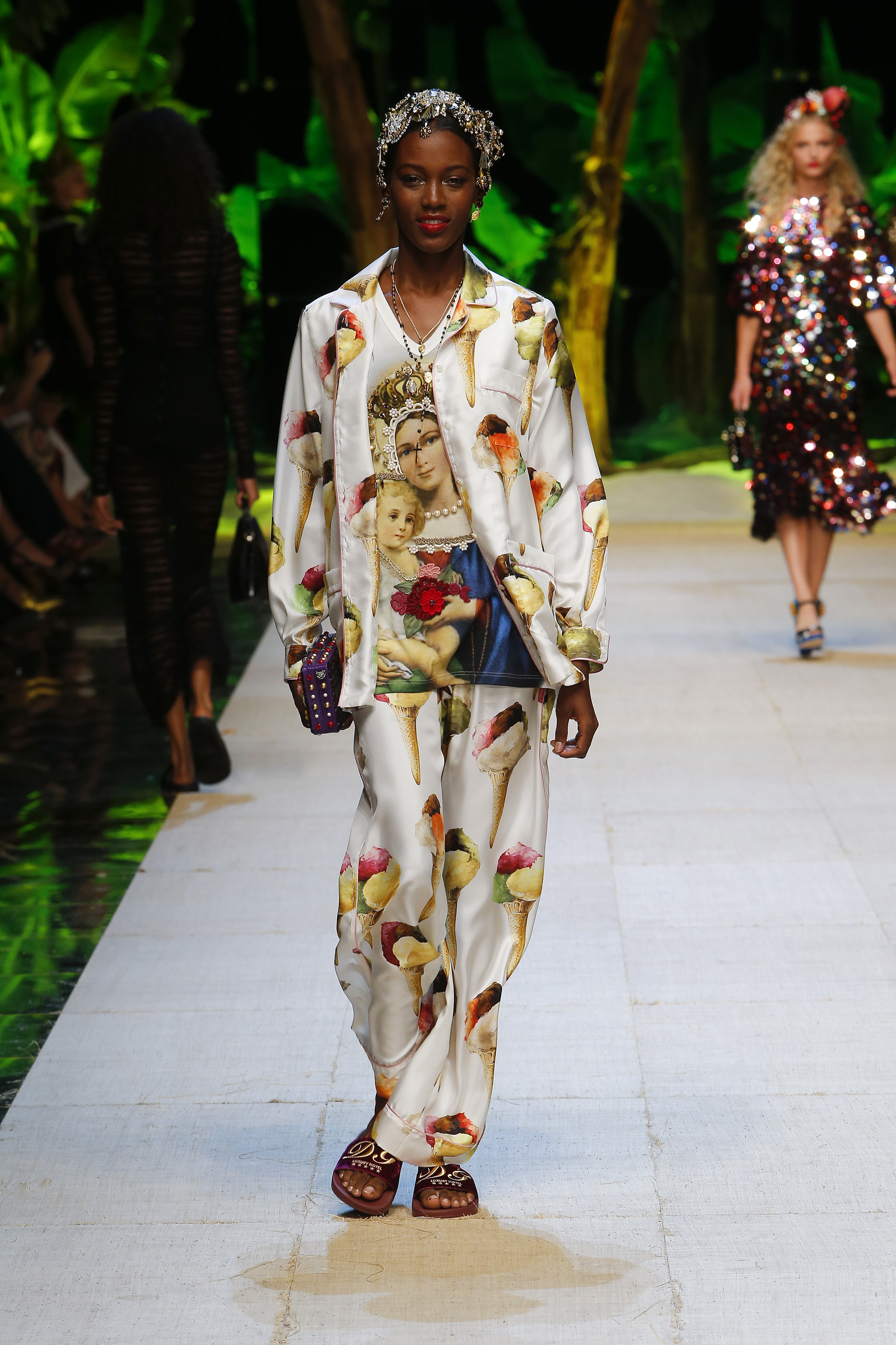 Arriva un momento, però, in cui la ripetitività nella moda annoia. E così è successo, solo che abbandonate le verze sulle camicette, Domenico e Stefano hanno dato spazio ai Millenials per cercare di dare un senso alla cafonaggine da indossare: la collezione dedicata al sud italia. L’idea, chiariamo, non sarebbe nemmeno malefica se solo D&G -che devono aver giurato ironia eterna a qualcuno di importante- non avessero deciso che i santini sulle giacche potevano essere fashion. No. Non lo sono. Domenico, Stefano: Santa Chiara sul bomber nero non è glamour. Al contrario, è incredibilmente trash e non importa se la collezione l’hai firmata tu, perché ti assicuro che nessuna ragazza con un lavoro e una reputazione glamour non la indosserà. Mai.