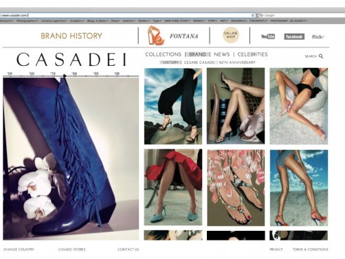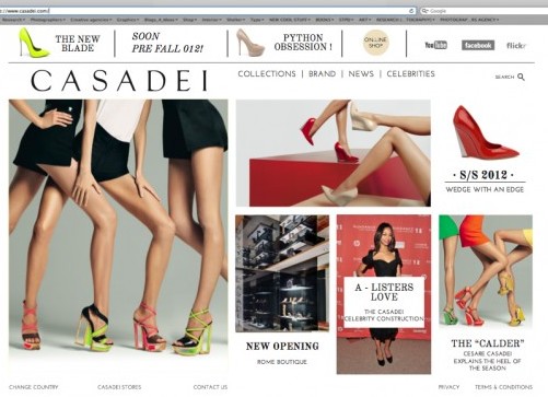 La homepage si apre con le immagini della nuova campagna pubblicitaria dove le modelle indossano i sandali dai colori fluo. Ulteriori tasti mettono in evidenza nuove aperture di negozi, i link ai Social Network (Facebook, Twitter, Flickr e YouTube) più una selezione dei migliori editoriali dedicati ai prodotti Casadei dalla stampa internazionale.