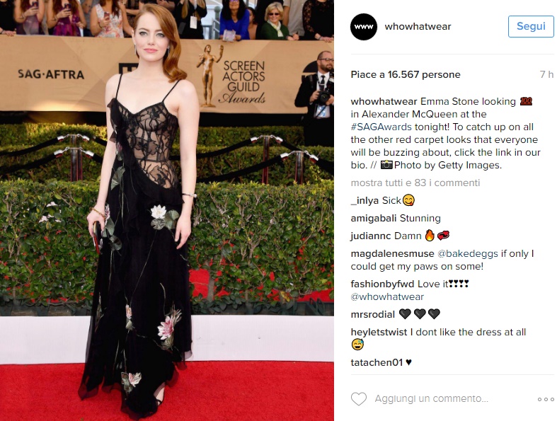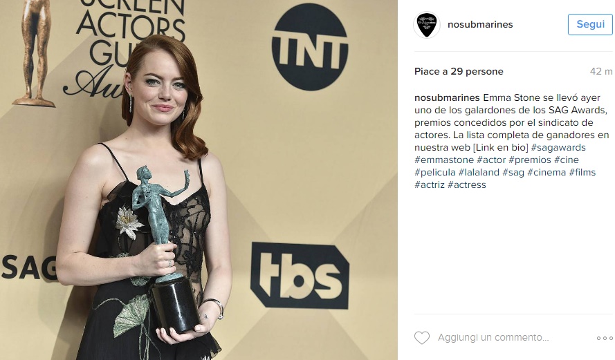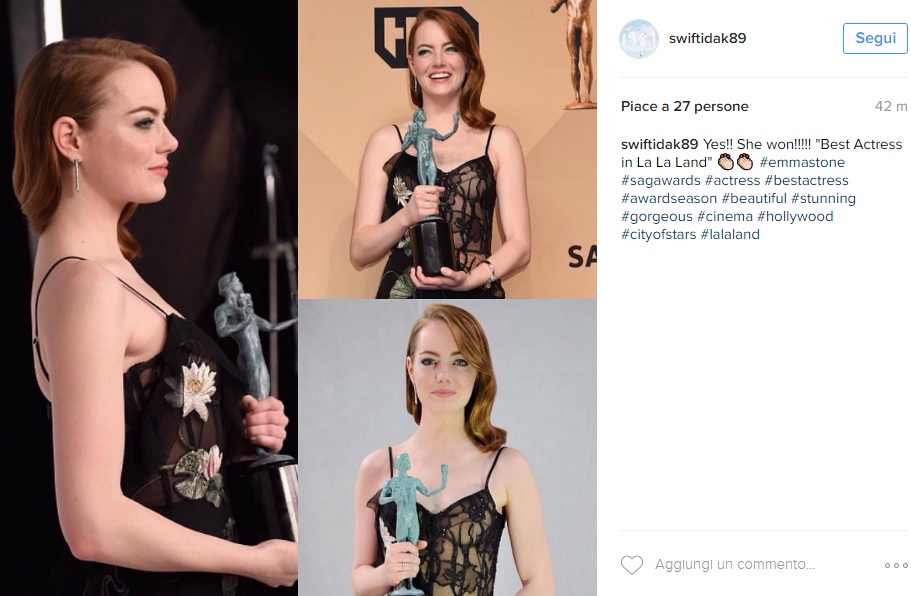 Che dire, Emma Stone era perfetta in una mise che ha incarnato il film con cui si è presentata ai SAG Awards, La La Land, che le è valsa anche il premio di attrice non protagonista. I SAG Awards sono un premio molto importante che di fatto apre la strada agli Oscar. Sono i premi consegnati agli attori e alle controfigure di cinema e tv dallo Screen Actors Guild (SAG), il sindacato di cui fanno parte più di 100mila attori americani. I SAG Awards sono appunto una sorta di anteprima dei premi Oscar e premiano solo attori e attrici, non i film e altre categorie professionali del mondo del cinema, come succede nella maggior parte degli altri premi. Durante la cerimonia sono stati assegnati 16 premi: sei per il cinema, nove per la televisione e un premio speciale alla carriera.