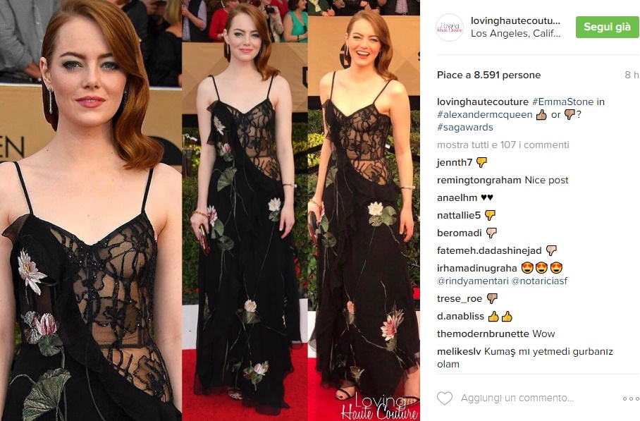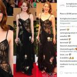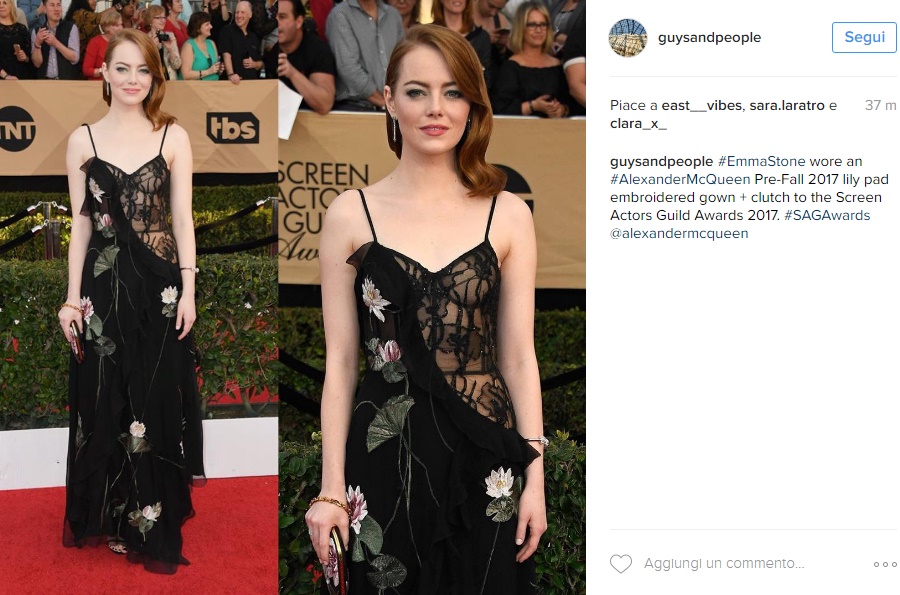 LOS ANGELES – Emma Stone osa: abito trasparente e pizzo nero FOTO. Bella, bellissima Emma Stone che, in occasione dei SAG Awards 2017 ha sfoggiato un meraviglioso abito firmato Alexander McQueen con trasparenze e pizzo nero che ha letteralmente catalizzato l’attenzione dei fotografi. Solo una bellezza informale come quella di Emma riesce a portare un vestito così particolare senza risultare volgare. E infatti, la Stone sfoggia con disinvoltura un tripudio di trasparenze, pizzo e fiori riuscendo ad apparire incredibilmente elegante e chic. Pettinatura e make up dal sapore retrò completavano il look.