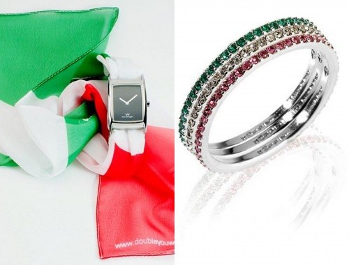 L’orologio con il W-FLAG interscambiabile e personalizzabile…per l’occasione nei colori della bandiera italiana, firmato Doubleyouwatch e gli anelli in argento 925/ooo e Swarowsky® griffati Zoppini che, proponendo tantissime varianti da abbinare fra loro, ci danno l’opportunità di mettere al dito i tre colori che contano di più…bianco, rosso e verde.