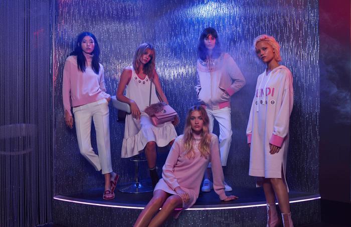 Il ready-to-wear comprende un top in maglia e un vestito di sfilata, creati in un delicato colore rosa cipria. Lo stesso pattern decora un bomber in raso con maniche in pelle, mentre alcuni cristalli impreziosiscono un vestito in raso, pantaloni denim bianchi e un abito-felpa. Tra le borse una Kan I F e Mini Kan I F con il nuovo logo rotondo F is Fendi in argento, da abbinare a una morbida Strap You in alpaca o a una Mini Strap You impreziosita da cristalli. Direttamente dalla passerella, gli stivali rossi Rockoko diventano corti e rosa, in pelle e velluto.