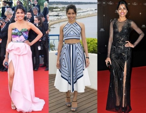 Freida Pinto in abiti (da sinistra) Michale Angel, Salvatore Ferragamo e Atelier Versace