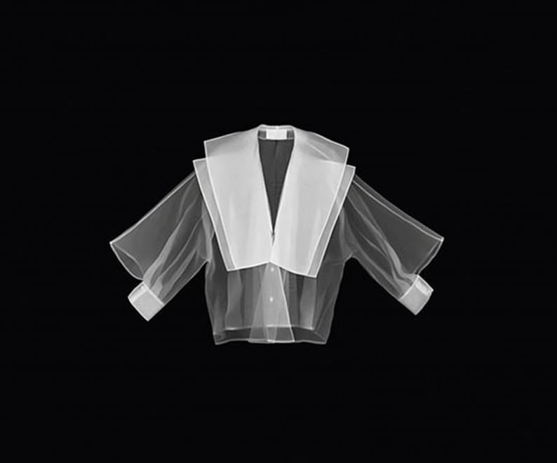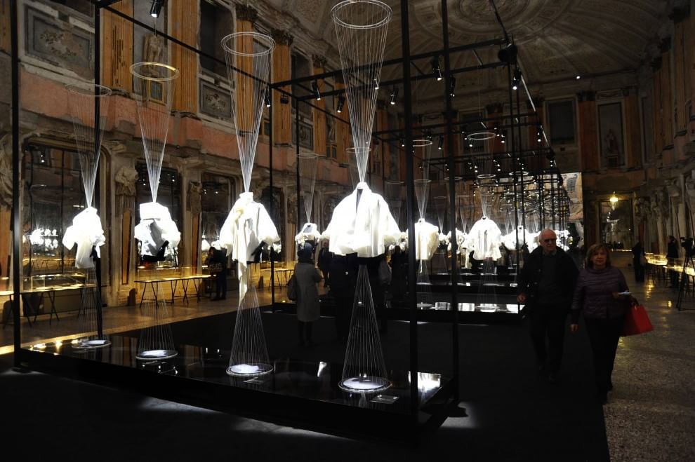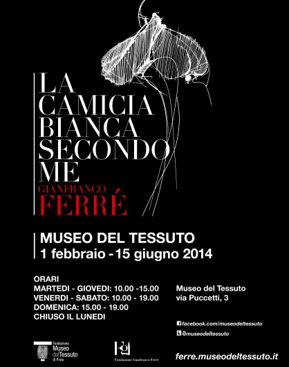 “Concepita per mettere in luce la poetica sartoriale e creativa dello stilista, la mostra conduce il visitatore, attraverso diverse forme di lettura, alla scoperta della camicia bianca, evidenziandone gli elementi progettuali più innovativi e le infinite interpretazioni. Presenza costante in tutta la sua carriera, la camicia bianca è stata definita dallo stilista “segno del mio stile” oppure “lessico contemporaneo dell’eleganza”. Il percorso espositivo gioca con la suggestione e la valorizzazione di elementi diversi, a corollario dei capi indossati su manichino: disegni, dettagli tecnici, bozzetti, fotografie, immagini pubblicitarie e redazionali raccontano lo stile dell’architetto della moda. Ventisette camicie bianche, veri capolavori sartoriali, testimoniano vent’anni di genialità creativa e progettuale. Esposte rispettando la cronologia della nascita, sono sculture bagnate da luce pensata per consentire al bianco di accendersi in diverse tonalità e alle ombre di fare da contrappunto. Taffetà, crêpe de chine, organza, raso, tulle, stoffe di seta o di cotone, merletti e ricami meccanici, impunture eseguite a mano, macro e micro-elementi si susseguono in un crescendo di maestria ed equilibrio. Sono anche esposti disegni tecnici, bozzetti, scatti di grandi maestri della fotografia, immagini pubblicitarie e redazionali provenienti dall’Archivio della Fondazione Ferré”