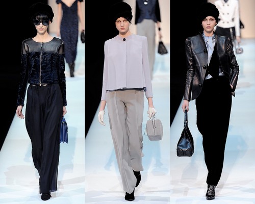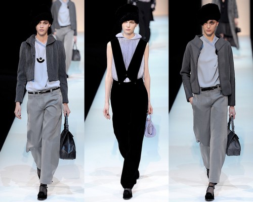 MILANO – Una garçonne chic e donna quella di Giorgio Armani, che con bretelle e pantaloni, baschi e stivaletti bassi riesce ad apparire più femminile che mai.