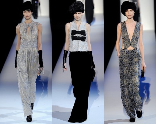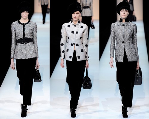 Anche ieri ogni uscita della sfilata della linea Emporio Armani era accompagnata da un copricapo: “Appena faccio un basco i miei collaboratori mi dicono che è un po’ pesante, ma sotto ci sono abiti che si possono mettere, il cappello o il tacco basso danno il senso della modernità”.