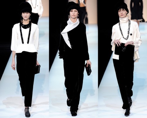 “Leggevo che la differenza tra il vestire dell’uomo e quella della donna oggi è relativa e la mia giovane vista da dietro può essere un uomo o una donna. Data per acquisita questa libertà, viene il gioco facile di come una donna può essere vestita da donna con elementi maschili” ha dichiarato Giorgio Armani subito dopo la sfilata.