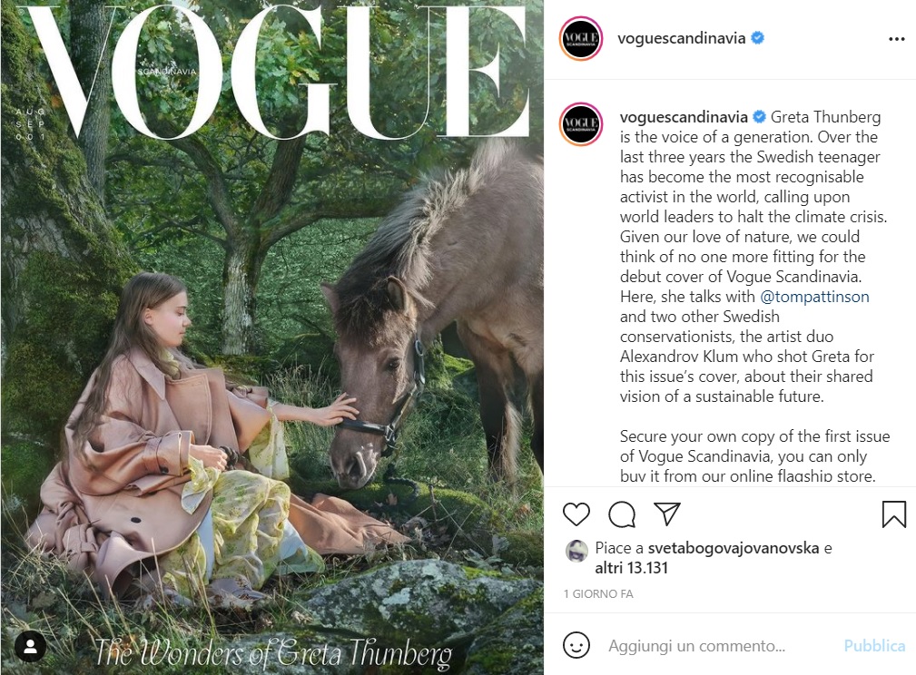 L’intervista per la nuova edizione di Vogue dedicata a Svezia, Norvegia, Danimarca, Finlandia e Islanda, è una vera e propria dichiarazione di intenti. “Greta è la voce di una generazione. Negli ultimi tre anni l’adolescente svedese è diventata l’attivista più riconoscibile al mondo, invitando i leader mondiali a fermare la crisi climatica. Dato il nostro amore per la natura, non potremmo pensare a nessuno più adatto per il primo numero”.