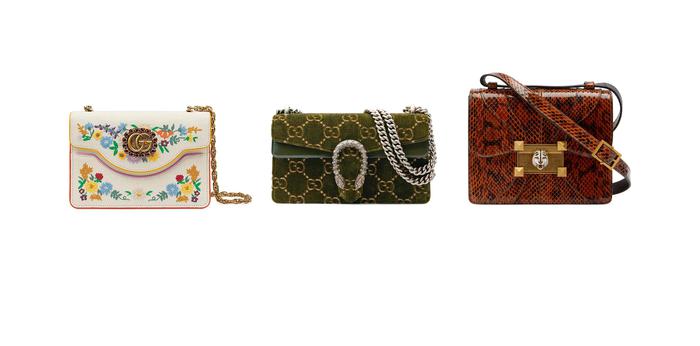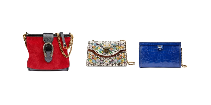 Ophidia è disponibile in una vasta gamma di materiali, dal GG Supreme (tessuto sempre più usato dalla maison) al sobrio suede in tinta unita (verde smeraldo e rosso ibisco). Ne esiste anche una variante su cui spicca un drago ricamato in filato multicolore, un motivo già presente nelle collezioni ready-to-wear uomo e donna.
