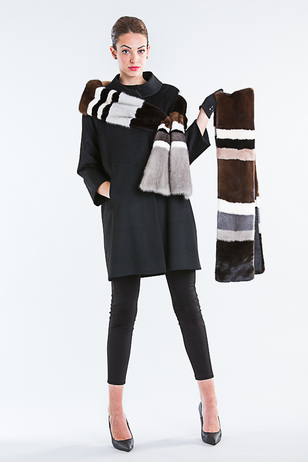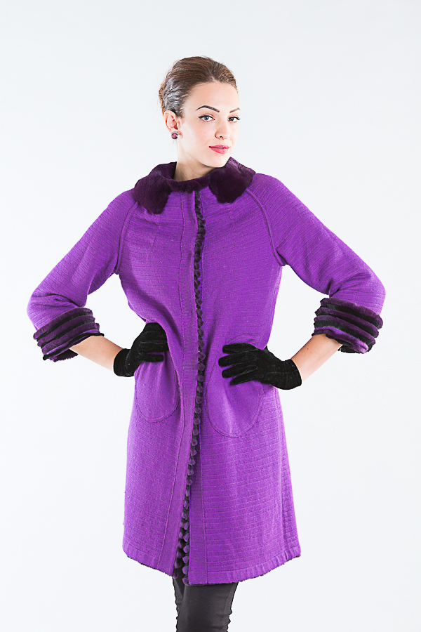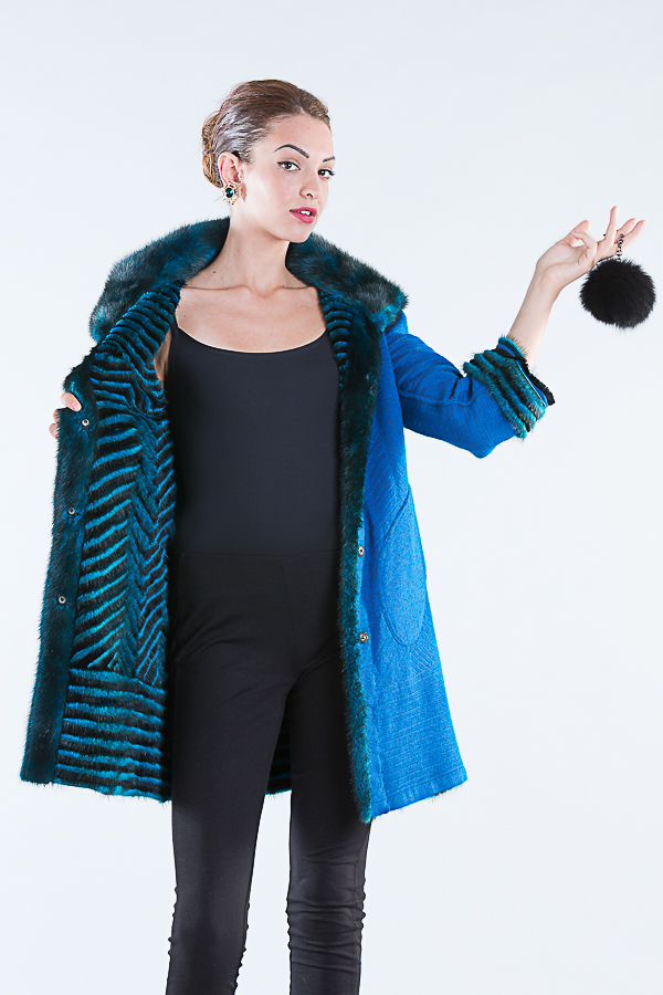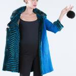 “Il visone si trasforma in un morbido fur-cardigan, reversibile, comodo e allo stesso tempo lussuoso, imbevuto nei colori del viola, turchese, bordeaux, blu oceano e grigio tortora. Si tratta di un capo con più funzioni: per il giorno il lato della lana cashmere, per la sera l’elegante visone”.