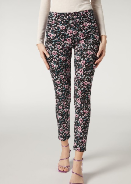I pantaloni Calzedonia sono di base neri ma con fiori a stampa rosa, aderenti e piuttosto corti alla caviglia, così da poterli abbinare anche con delle scarpe con tacco, lasciando in bella vista la calzatura.