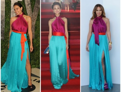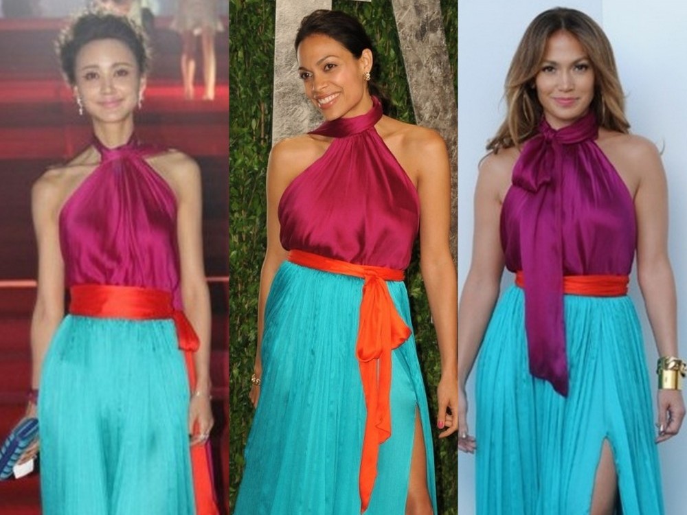 Rosario Dawson è stata la prima ad indossare questo abito, il 26 Febbraio scorso, in occasione del “Vanity Fair Oscar after-party”. Ha tirato su i capelli e ha aggiunto degli orecchini importanti, ha poi abbinato delle peep toe viola scuro con plateau.