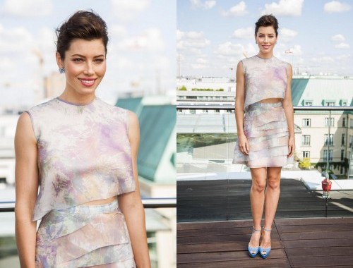 Jessica Biel ha optato per un completo p/e 2011 di Christian Cota, dal sapore prettamente estivo ma allo stesso tempo chic. Colori chiari sul bianco e sul lilla facevano da cornice a questo completo formato da top e gonna a balze sotto cui ha abbinato dei sandali peep-toe di Brian Atwood. Semplice ed elegante.